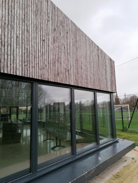 Le bardage Bois, passant devant les châssis, est utilisé en tant que Brise Soleil