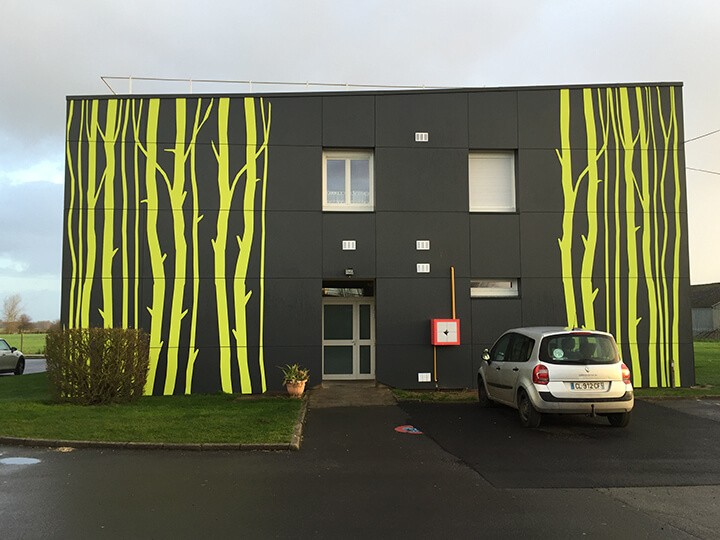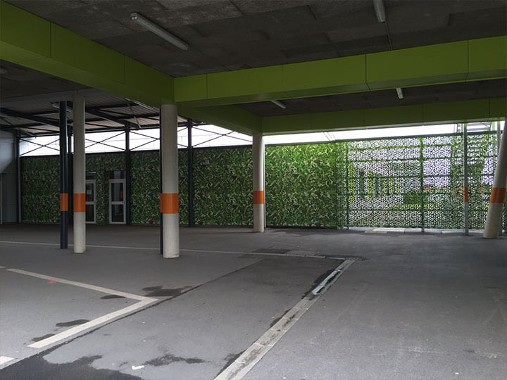 Nous avons mis en œuvre du bardage FUNDERMAX perforé afin de laisser passer la lumière dans le préau. de plus, nous avons opéré de la découpe laser des panneaux FUNDERMAX pour créer un aspect d’arbre sur les façades.